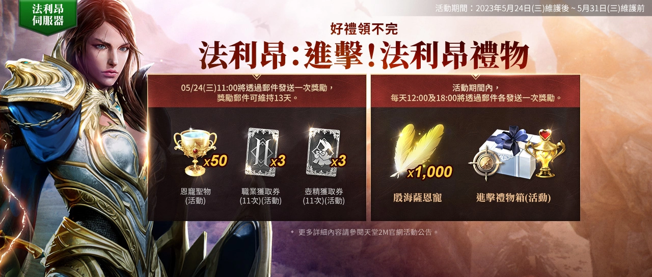 【法利昂:进击!法利昂礼物】5/24 11:00~5/31 10:59,活动期间内,将发送「进击!法利昂」特别邮件,可获得包含「恩宠圣物(活动)*50、职业获取券(11次)(活动)*3、壶精获取券(11次)(活动)*3」等道具。