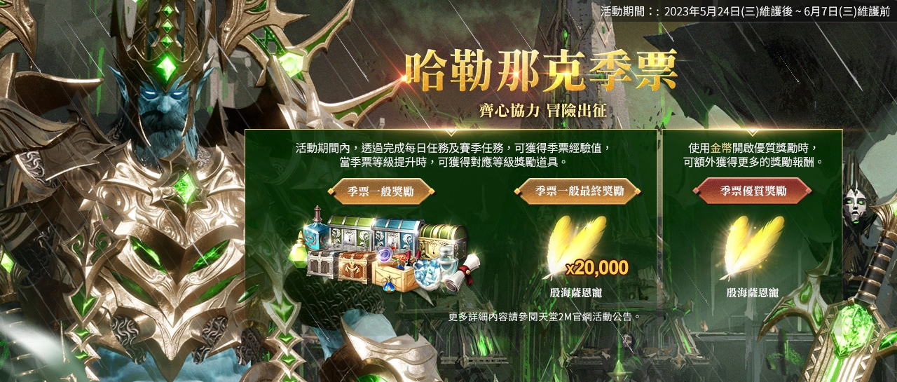 【哈勒那克季票】5/24维护后~6/7维护前,活动期间内,透过完成每日任务和赛季任务,可获得季票经验值,当季票等级提升时,可获得对应等级的奖励道具。使用金币开启优质奖励时,可额外获得更多的奖励报酬。