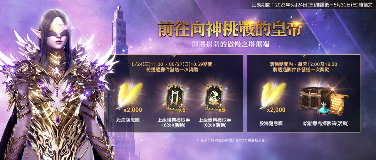 【前往向神挑战的皇帝】5/24 11:00~5/31 10:59,活动期间内,将透过邮件发送一次奖励,可获得包含「殷海萨恩宠*2,000、上级职业获取券(6次)(活动)*5、上级壶精获取券(6次)(活动)*5」等道具。