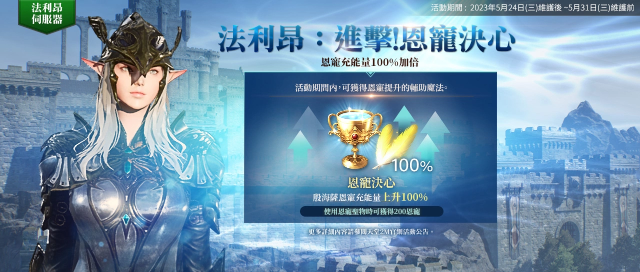 【法利昂:进击!恩宠决心】5/24维护后~5/31维护前,活动期间内,套用「殷海萨恩宠补充量增加100%」辅助魔法效果。