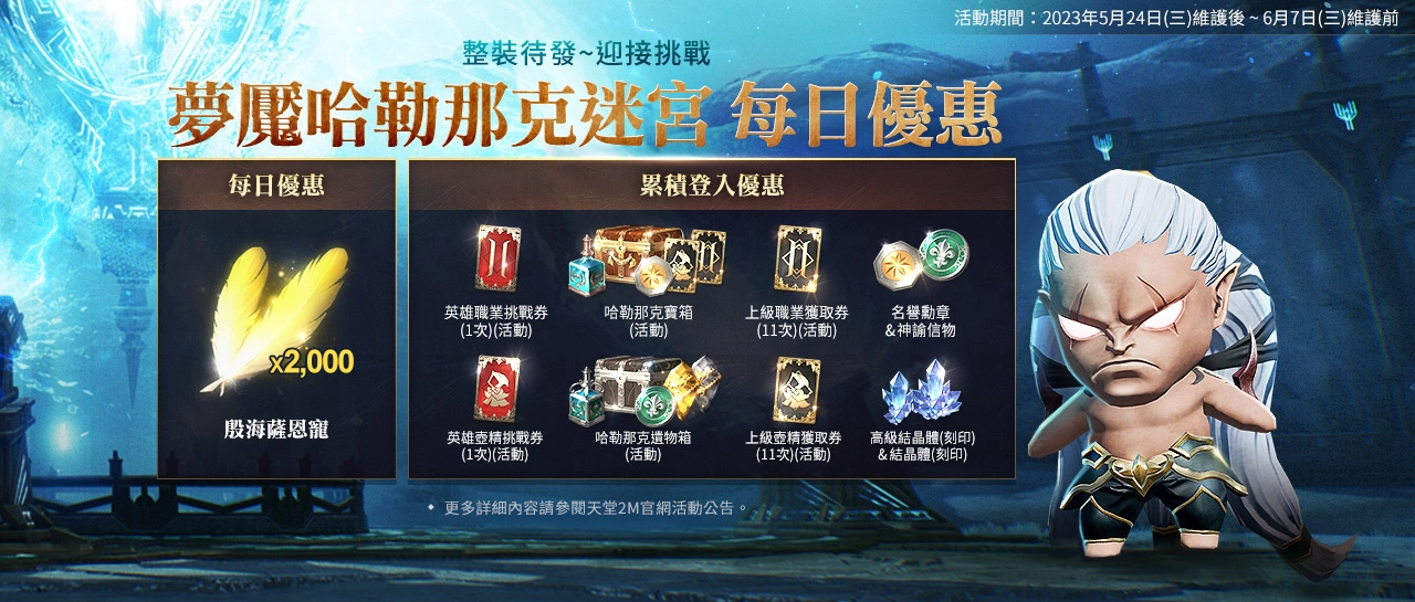 此外,5/24维护后~5/31维护前,活动期间内,每天中午12:00及晚上18:00将透过邮件各发送一次奖励,可获得包含「殷海萨恩宠*2,000、哈勒那克探险箱(活动)」等道具。