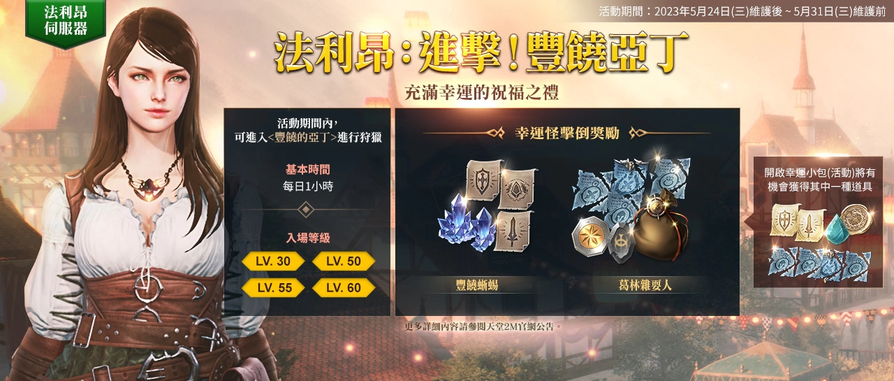 【法利昂:进击!丰饶亚丁】5/24维护后~5/31维护前,活动期间内开放「丰饶之地」活动副本,狩猎活动副本内的怪物,可获得「结晶体(刻印)」与「高级结晶体(刻印)」;击倒副本内的幸运怪「葛林杂耍人」、「丰饶蜥蜴」时,可获得各种道具。