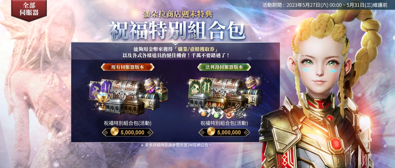 【祝福特别组合包】5/27 00:00~5/31维护前,活动期间内,全伺服器皆可使用金币购买「祝福特别组合包」,内含「职业/壶精获取券」,以及各式各样的道具。