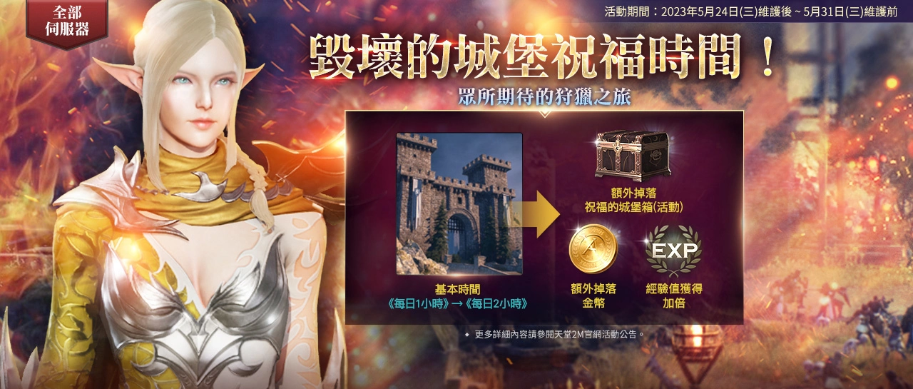 【毁坏的城堡祝福时间】5/24维护后~5/31维护前,活动期间内,全伺服器毁坏的城堡副本基本使用时间、获得经验值增加、金币及「祝福的城堡箱(活动)」将额外掉落。