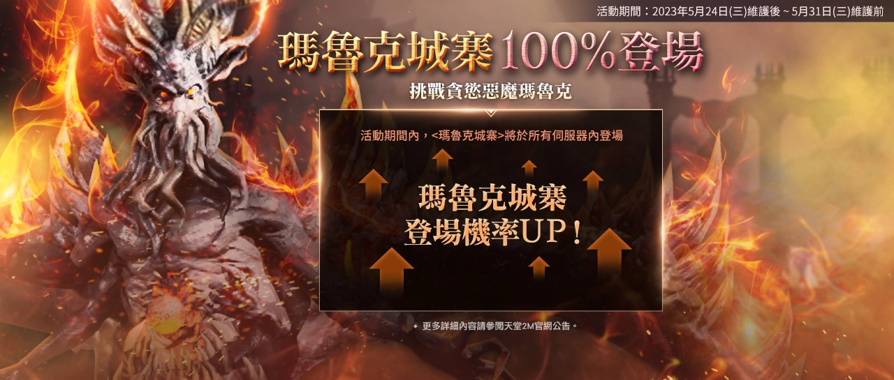 【玛鲁克城寨100%登场】5/24维护后~5/31维护前,活动期间内,「玛鲁克城寨」将于所有伺服器内登场。
