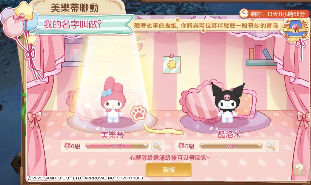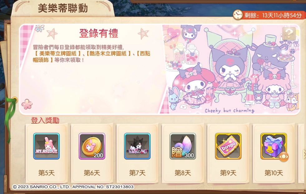 酷洛米军团与美乐蒂家族準备了许多精緻的礼物,将于活动期间派送给所有报到的勇敢冒险者们,这些礼物不仅包含实用的货币资源,还有可以摆设在家园里的美乐蒂与酷洛米看板,以及精美的造型头饰,错过了这次难得的机会,可就再也拿不到啰!