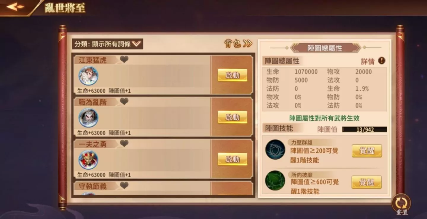 武将奇事皆列传,三国典故俱收藏。主公等级达 75 级以上开放「武将列传」系统,武将列缀纪载多个章节,每个章节拥有数个能增加不同属性的三国典故及两个技能;只要收集指定武将传记便可启动列传中的典故并获得属性加成与阵图值,累积足够阵图值便可解锁下一章节,另可透过「传世英杰令」解锁并提升技能。