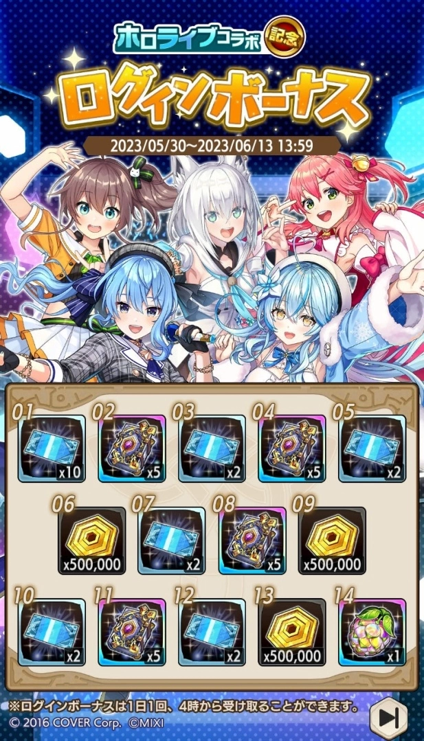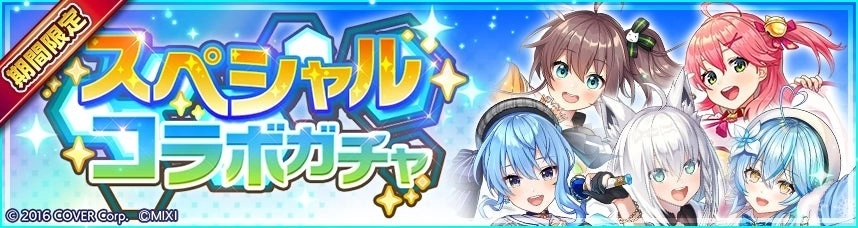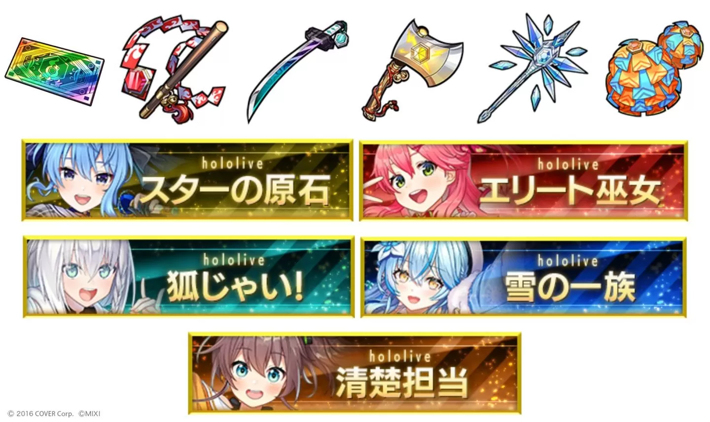 在本次合作中,hololive 的白上吹雪、夏色祭、樱巫女、星街彗星、雪花菈米五位 Vtuber 将在特别合作转蛋内现身,首次抽中合作角色的话会追加赠送让角色觉醒用的 soul,而在转蛋次数到一定程度时还会能获得 soul 兑换卷。
