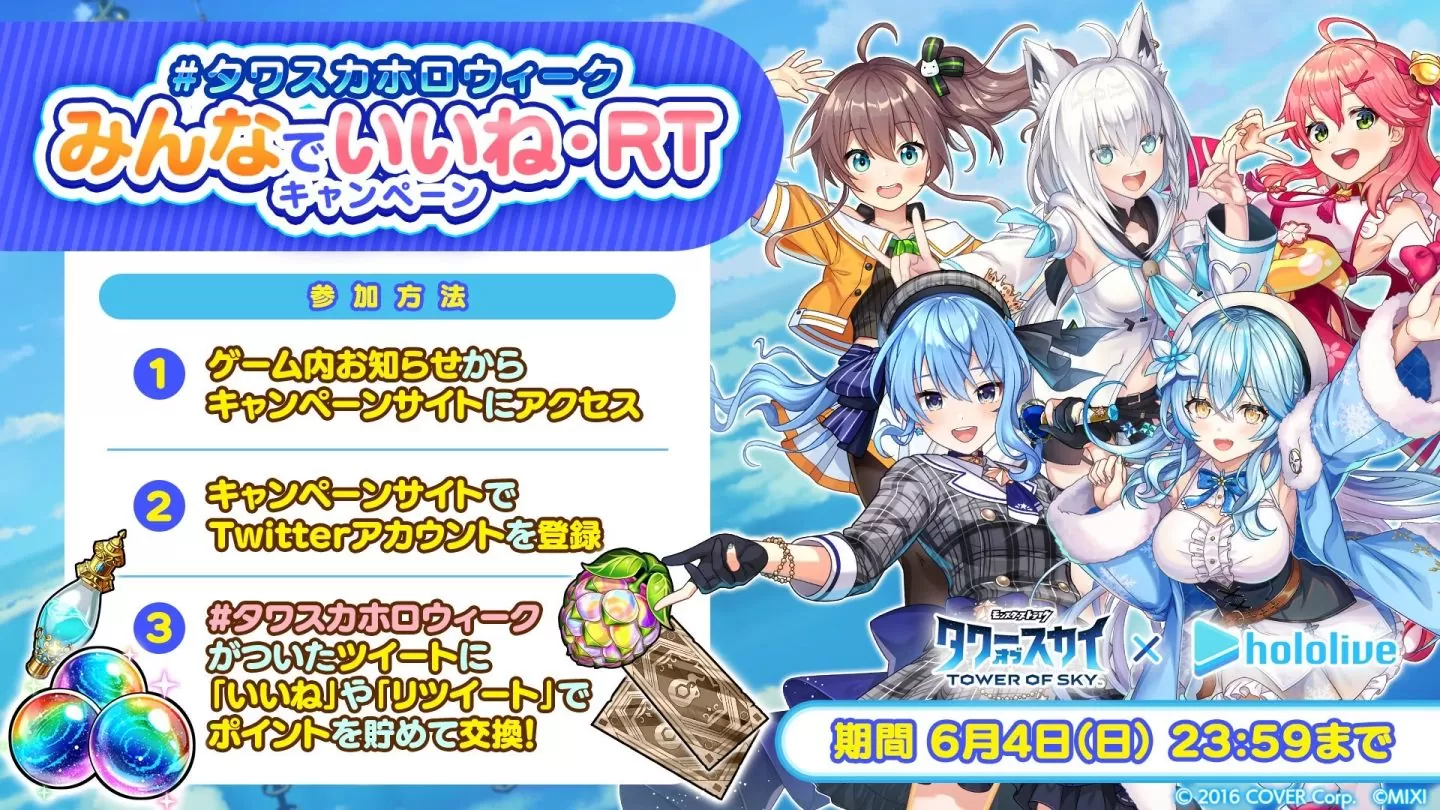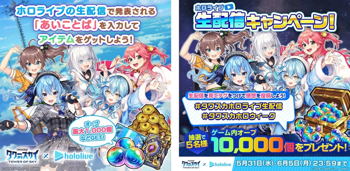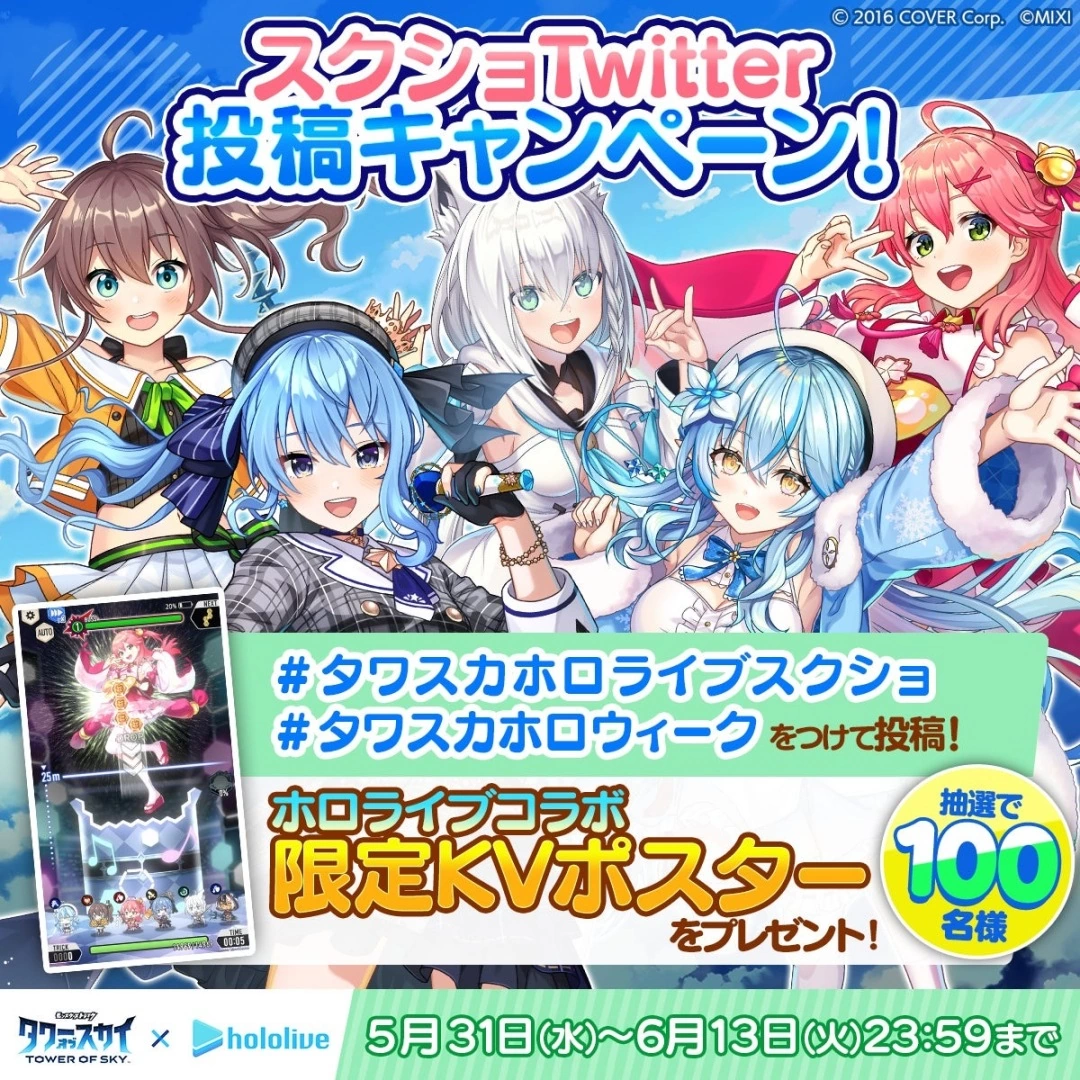 从 5 月 31 日起,《Tower of Sky 天空之塔》的玩家可以将游戏截图加上标籤「#タワスカホロライブスクショ」或「#タワスカホロウィーク」并发文到推特上,就会抽出 100 名幸运儿赠送合作 Vtuber 们的特别海报。