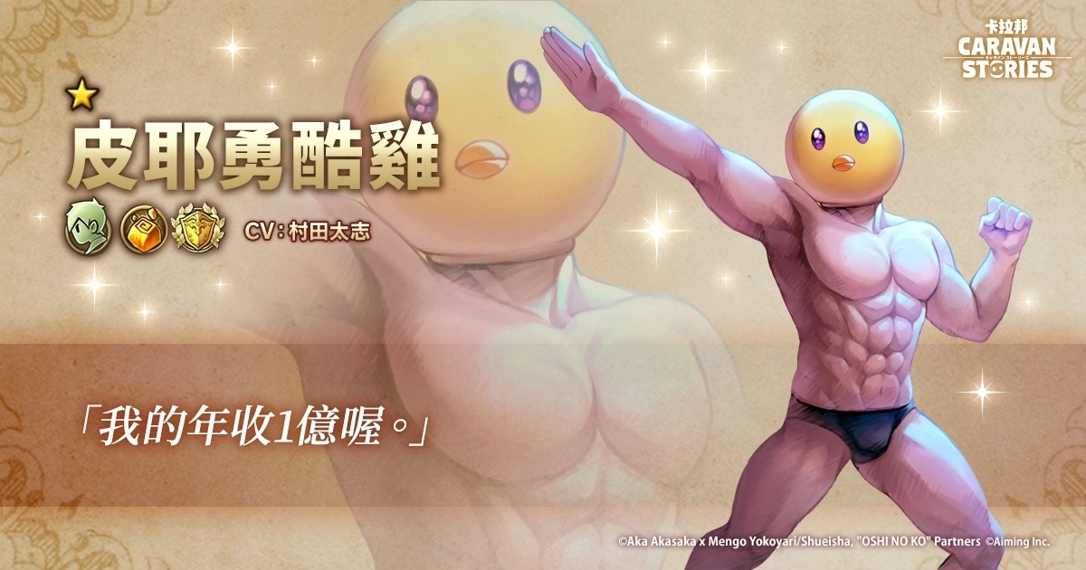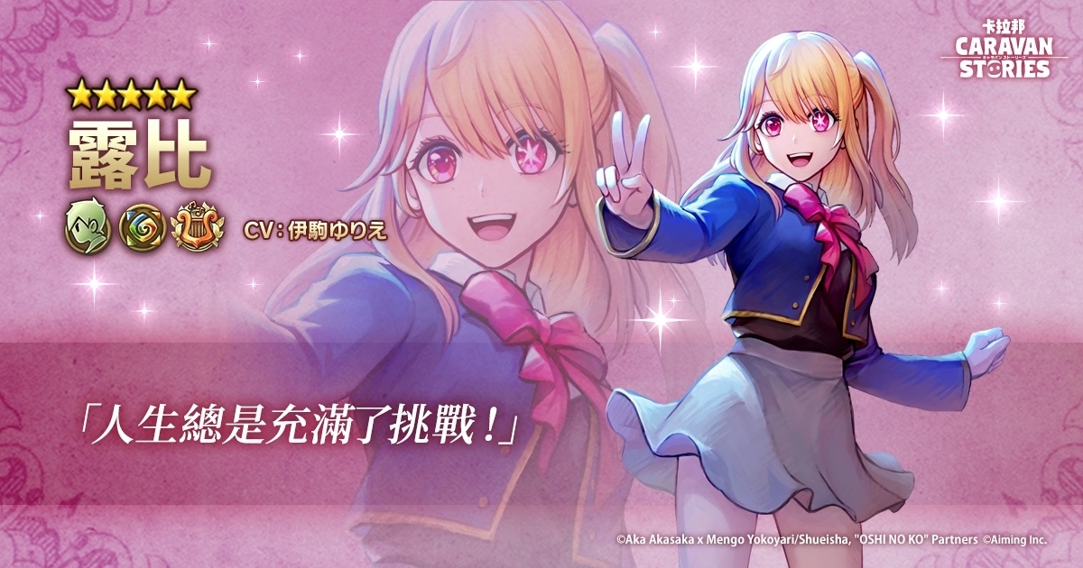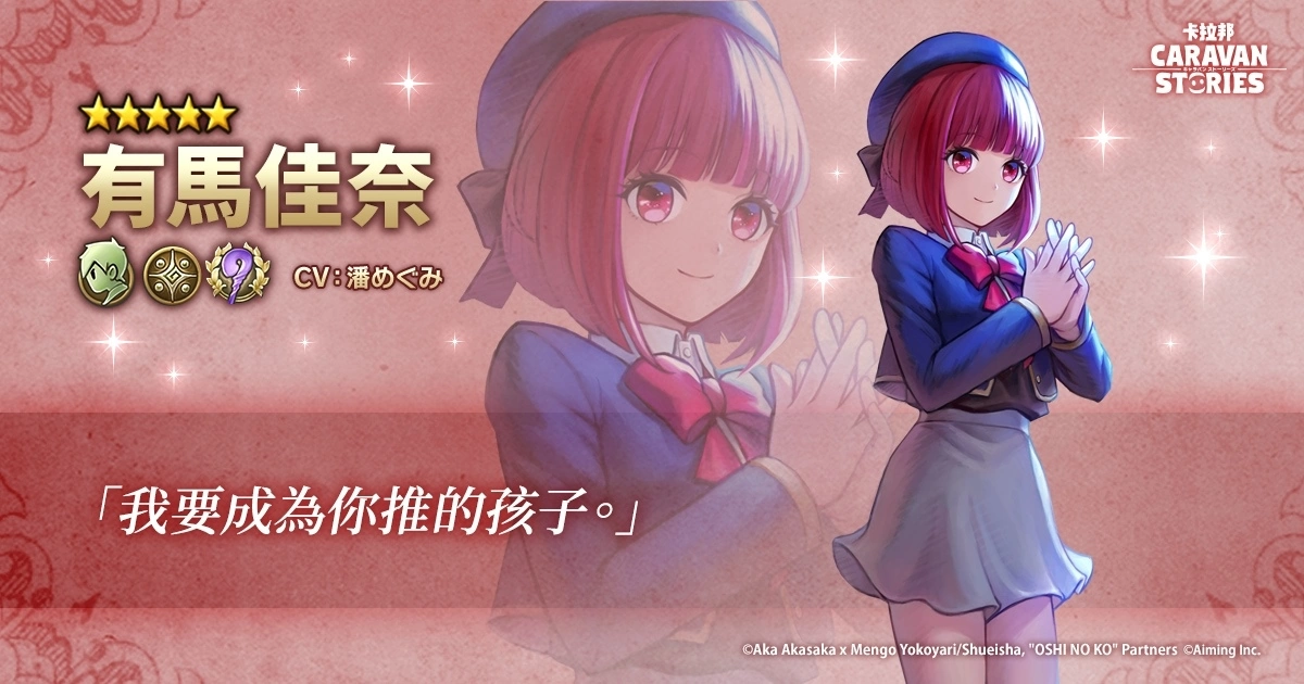 动画《我推的孩子》与《CARAVAN STORIES》的合作活动,将于手机版/Windows 版/PS4 版同步展开。在本次合作活动中,「阿奎亚」、「露比」、「有马佳奈」和「皮耶勇酷鸡」这 4 名角色将化身为可操控的角色登场。