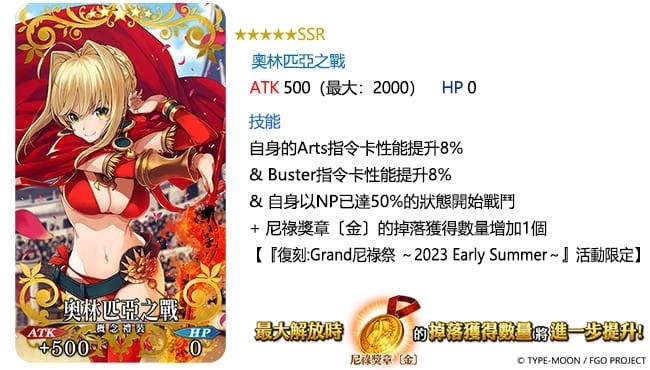 而「★5(SSR)奥林匹亚之战」、「★4(SR)美味竞技场」及「★3(R)肌肉骑士」等3款限时概念礼装,也将登场于上述两个 PICK UP 召唤中。当御主们装备挑战「复刻:Grand尼禄祭~2023 Early Summer~」时,除了拥有既有的增益效果,通关后还能有效提升「尼禄奖章(金/银/铜)」等活动道具的掉落获得数量。