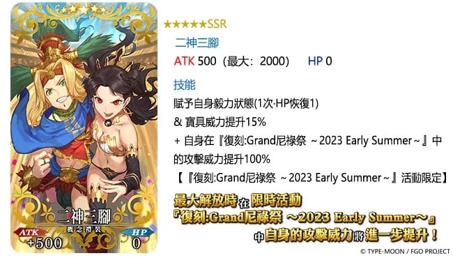 在接续举办的「复刻 Grand尼禄祭~2023 Early Summer~PICK UP召唤1」及「复刻 Grand尼禄祭~2023 Early Summer~PICK UP召唤2」中,将登场「布伦希尔德〔Lancer〕」及「★5(SSR)尼禄・克劳狄乌斯〔Caster〕」等 2 骑人气从者。