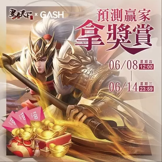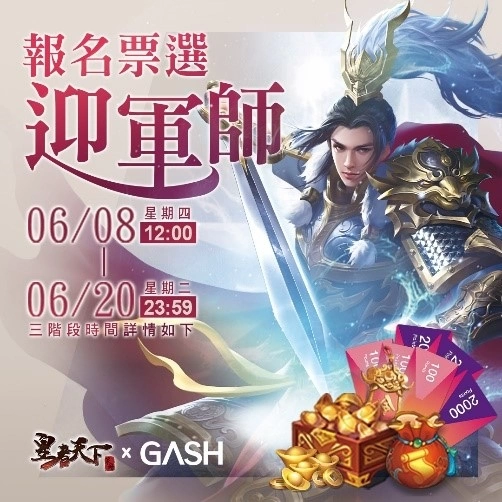 与实况主近距离接触的机会来啰!开放玩家报名参选军师,辅佐实况主夺下三国霸业,同时开放玩家投票,票选出三位军师,提供策略让三位实况主夺得最后的胜利,获选的军师即可获得 GASH 2000点,最后带领实况主胜出的军师,还可获得最高 GASH 4000 点的奖励!