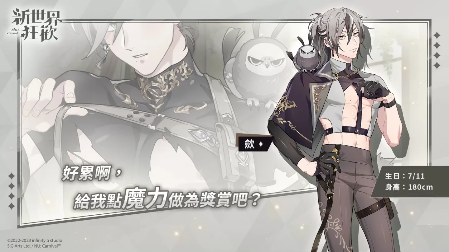 突然出现于众人面前的神祕眷属,带着一只被他称为「老爸」的鬼鸮。语气带有些微的轻浮感,且相当擅长展现自己的个人魅力。行事风格我行我素。在遵循自身信念的情况下,为达目的会有些不择手段。因不明原因,魔力偶尔会出现异常而带来强烈的痛苦。这样的他对于「魔力调和」一事,似乎也有着一套独特的技巧和……?