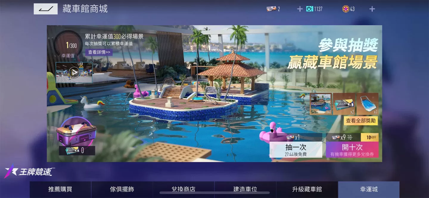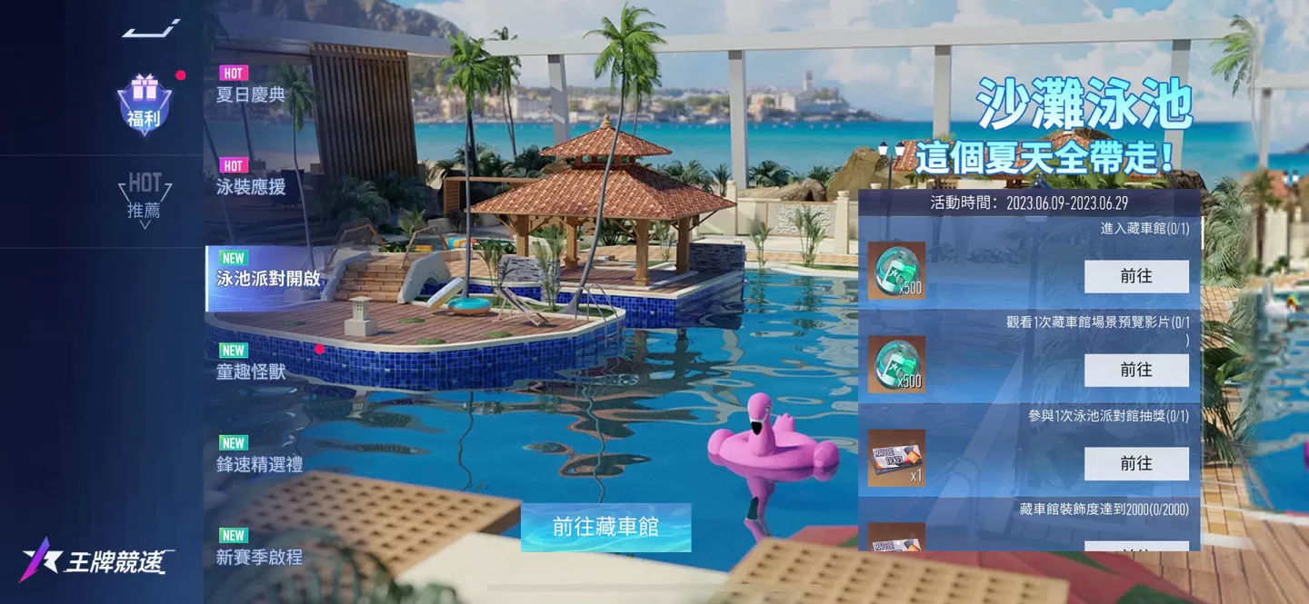 玩家可以透过藏车馆-幸运城抽奖获得泳池派对藏车馆,每次抽奖将累计幸运值,达到指定幸运值后必得新场景。『泳池派对开启』赛车手们可以先前往福利活动中,完成任务即可领取藏车馆抽奖券。