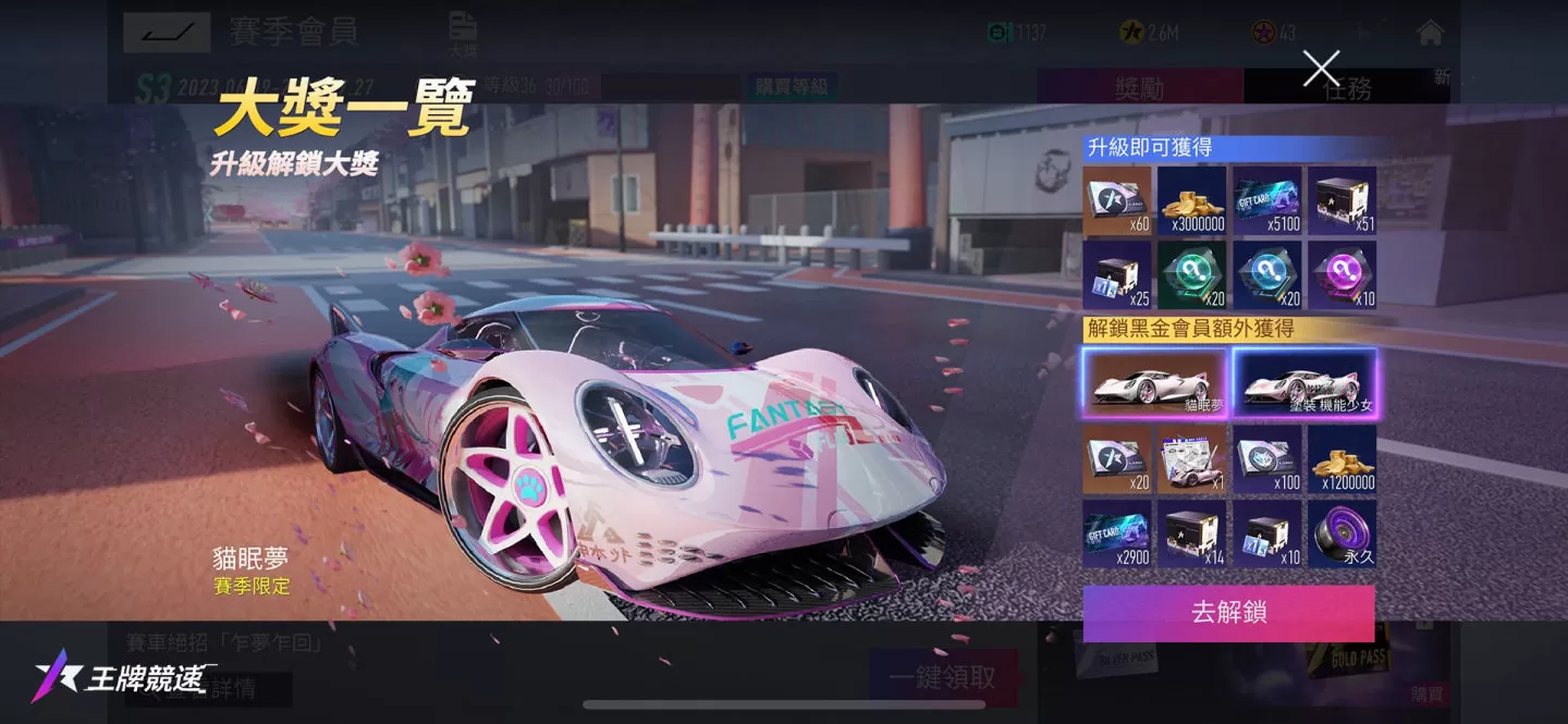 S3赛季会员登场,可以获得全新辅助车辆-猫眠梦,拥有专属技能「乍梦乍回」。不仅如此,还有时装、车辆涂装、补给箱等奖励等你来拿!