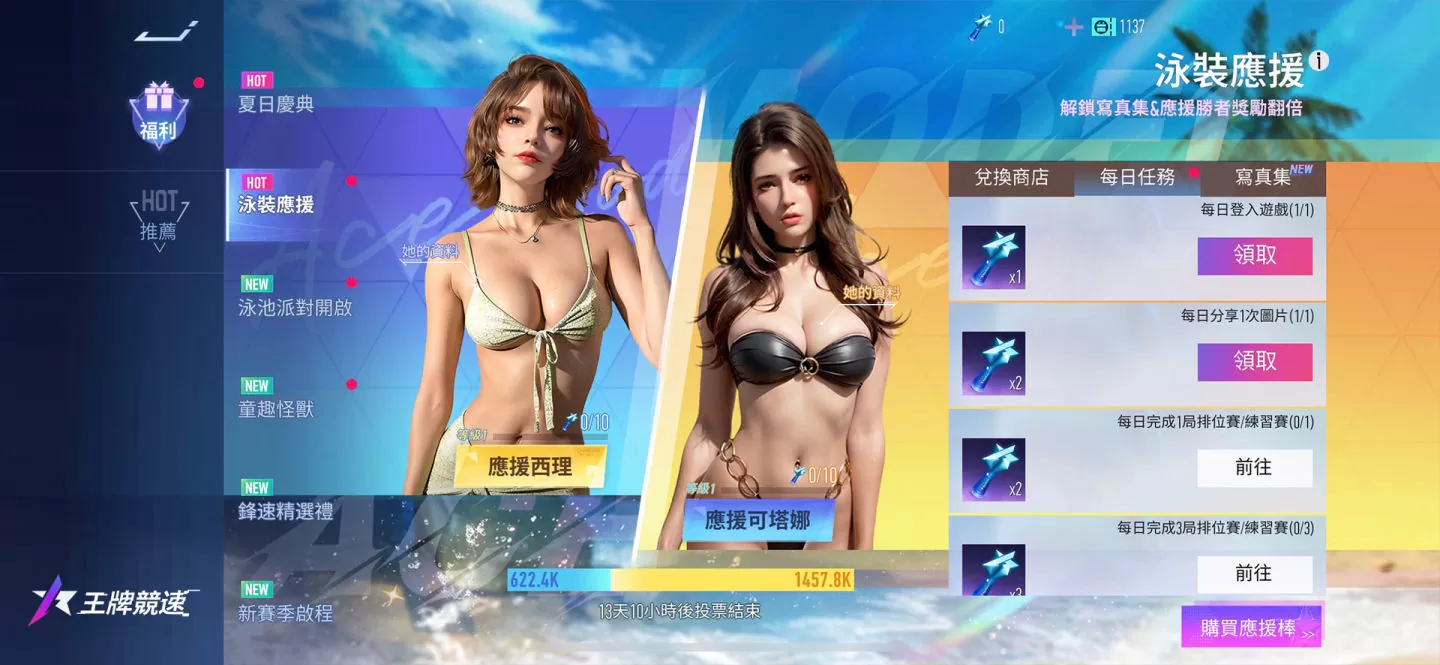 『泳装应援』西理和可塔娜的泳装PK大赛将于6.9日隆重举行。每日完成任务可获得应援棒,用于助力两位美女NPC。参与应援后,不仅能解锁绝美的写真集,结算后还能返还更多应援棒用来兑换奖励。