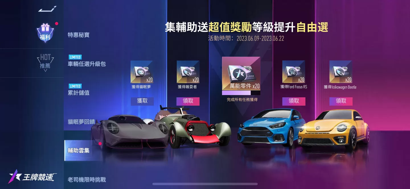 团队支柱,充沛能量!6.9-6.22,收集猫眠梦、杂耍者、Focus Rs、大众Beetle即可获得对应零件奖励,全部集齐可以额外获得万能零件。