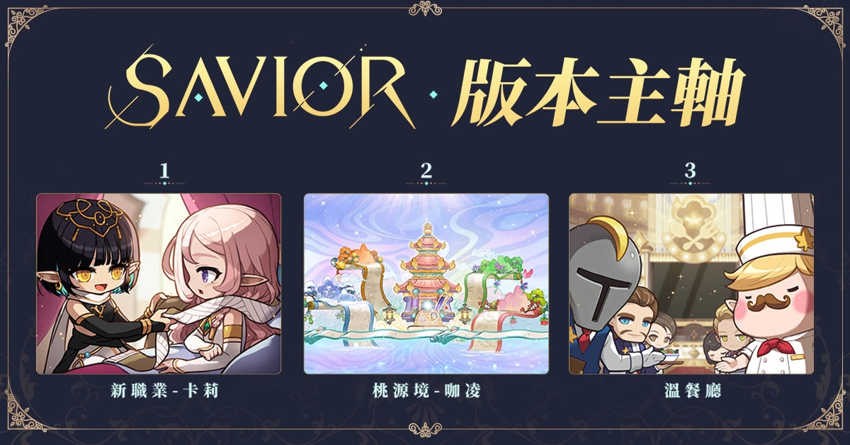 【SAVIOR】改版睽违一年半释出全新职业「卡莉」、新地区「桃源境」、新 BOSS「咖凌」、新主题活动「温餐厅」。新职业「卡莉」角色设定为出生于沙漠都市的「格兰蒂斯雷普族」盗贼,拥有特殊武器「环刃」可近距离攻击敌人,并搭配快速移动的技能,展现高自由度的战斗方式,「卡莉」中东沙漠风情的背景设定,呈现神秘与力量的魅力,值得冒险家体验!