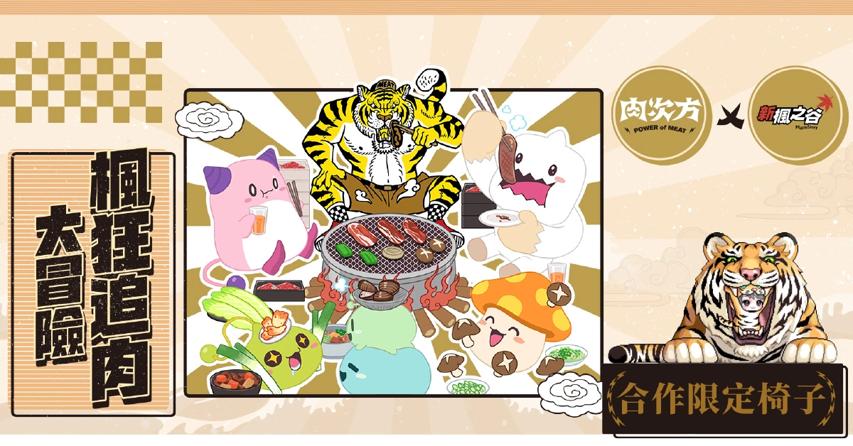 【枫狂追肉大冒险】与王品集团旗下人气烧肉吃到饱品牌「肉次方烧肉放题」合作,该品牌主打现切肋眼牛排、提供 50 多种肉品及海鲜吃到饱,深受年轻族群喜爱。本次联名于 7 月 17 日至 8 月 31 日期间推出限定联名菜色、联名虚宝及周边!活动期间于全台指定门店,内用外带消费满 1,000 元,可获得合作限定虚宝「虎虎生枫椅子」*1,内用消费满 1,999 元,可加码再抽限定实体周边。6 月 17 日起开放订位,敬请把握,抢先卡位!