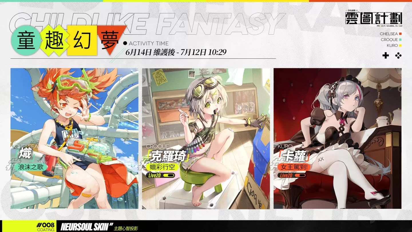失去的时间假使能够倒转,那最想回到无忧无虑的时候,尽情玩耍一番!限时推出「童趣幻梦」系列投影,共包含「炽-浪沫之歌」、「克罗琦-蜡彩行空」、「卡萝-女王驾到!」等三位人形的心智投影,其中「克罗琦-蜡彩行空」、「卡萝-女王驾到!」皆搭载Live2D功能,教授可使用时装兑换券购买。