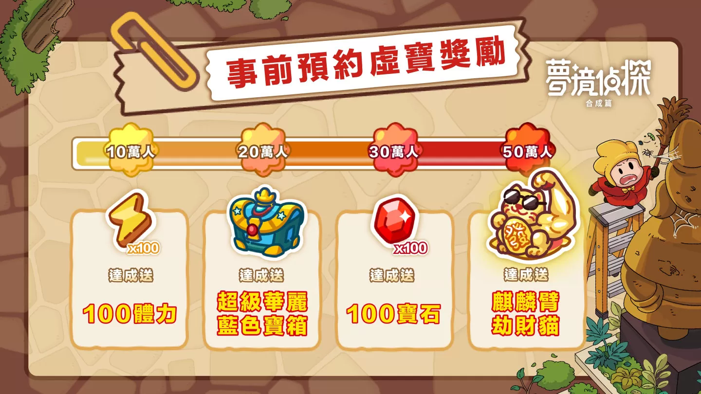 Century Game 官方表示目前营运团队正进行游戏上市前最终调整,满心期待要带给台港新马玩家最沉浸的游戏体验,与此同时也大方宣布事前预约好礼 ─ 玩家预约里程碑人数达 10 万全服赠送合成体力 100 、达 20 万人全服赠送超级华丽蓝色宝箱、达 30 万人全服赠送 100 宝石、达 50 万人全服赠送「麒麟臂劫财猫」 (可产出宝石与钞票)。