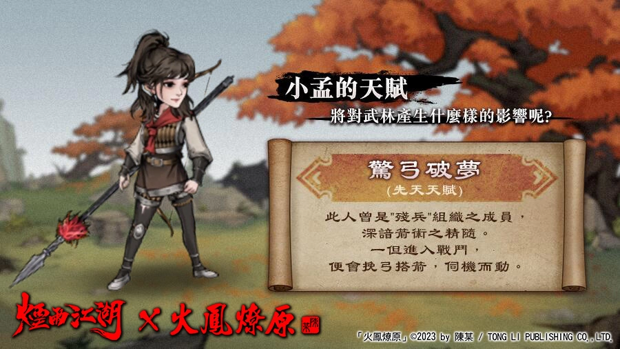 经典三国作品《火凤燎原》的超人气角色—「小孟」正式于《烟雨江湖》大世界登场!熟悉原作的玩家都知道小孟本为宦官,因宫中动乱而逃往司马家避难,其后加入残兵。有着百步穿杨的精绝箭术,同时也是个下毒高手。这次联动合作中「小孟」将带着高超的武术登场于《烟雨江湖》的世界中,教导各位大侠成为更强的武林高手!