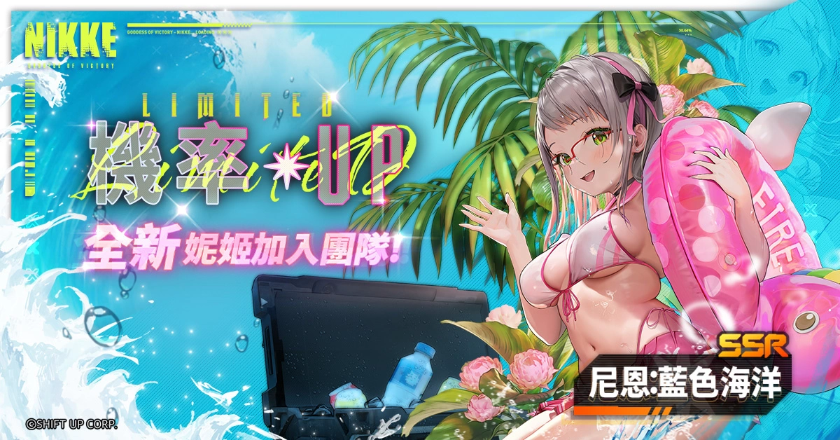 本次更新后,另一位以夏日限定型态的 SSR 妮姬为「尼恩:蓝色海洋」!该妮姬生产公司为极乐净土,隶属反击部队,元素为水冷,武器为机枪,是火力型角色。