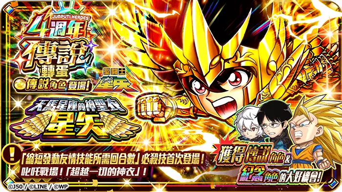 除了以传说角色身分登场的全新型态星矢之外,另外还有纪念角色「贝吉达&特南克斯」、活动角色「城户沙织」、「人造人16号」与全新传奇英雄「复甦的黄金圣斗士」等人也都会登场!丰富的豪华奖励以及帅气新角色,热闹滚滚的4週年感谢祭现正进行中,赶快把握机会参加这场隆重盛会!