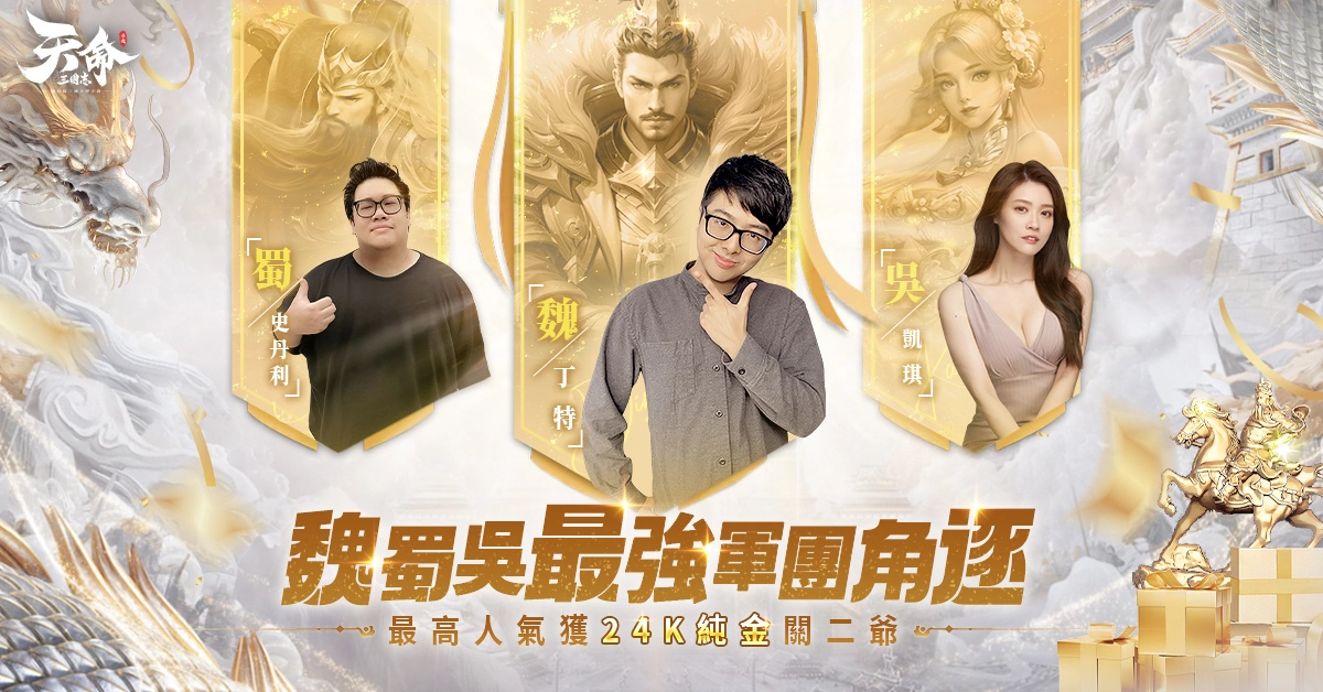 官方表示,事前活动还开放了「军团集结」活动,丁特、史丹利、凯琪分别担任魏蜀吴三国的军团长,征集各位天命所归,于关二爷像下与你们互道兄弟,共同为军团打Call,一起赢下24K纯金关二爷!