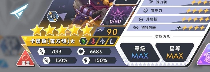 技能「贯穿刀」能对路径上的敌人造成伤害,并给予一定时间内受到的伤害提高(破甲)的负面效果。此外奥义「升龙斩」新增全新效果浮空,能让一定範围内小、中体型的敌人无法移动与攻击,并且受到攻击时必定爆击,是相当强势的控场技能!当卡尔顿(东方魂)不幸阵亡时,还能大幅提高周围友军的战斗力!