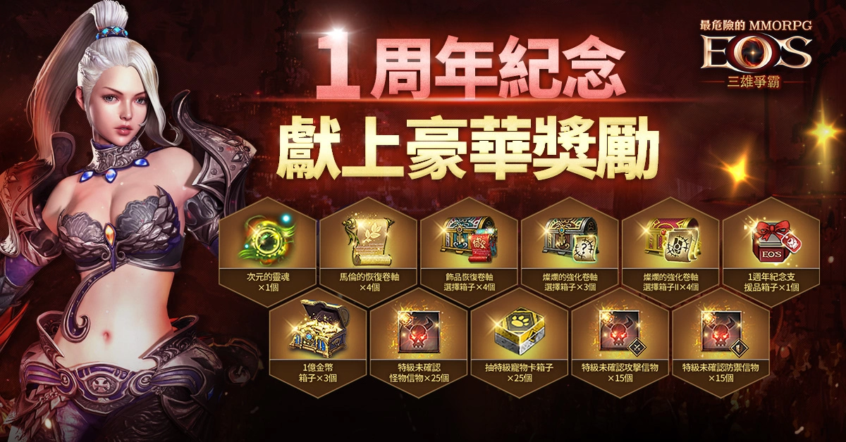还有「1週年回锅活动」,活动期间内回锅的天选者等级达到 60 等,即可获得包含「怪物图鉴效果保存券」、「高级未确认怪物信物」、「特级未确认怪物信物」、「抽中级宠物卡箱子」等 10 种珍稀道具奖励,此外,官方也将于活动期间抽出共 20 位幸运的天选者,送出 MyCard 点数 2500 点的实体奖励。而有参加事前预约活动的天选者,也可领取「次元的灵魂」、「马伦的恢复卷轴」、「饰品恢复卷轴选择箱子」、「灿烂的强化卷轴选择箱子I / II」、「1周年纪念支援品箱子」、「1亿金币箱子」、「特级未确认怪物信物」、「抽特级宠物卡箱子」、「特级未确认攻击信物」、「特级未确认防御信物」等预约奖励啰!