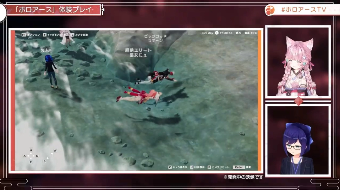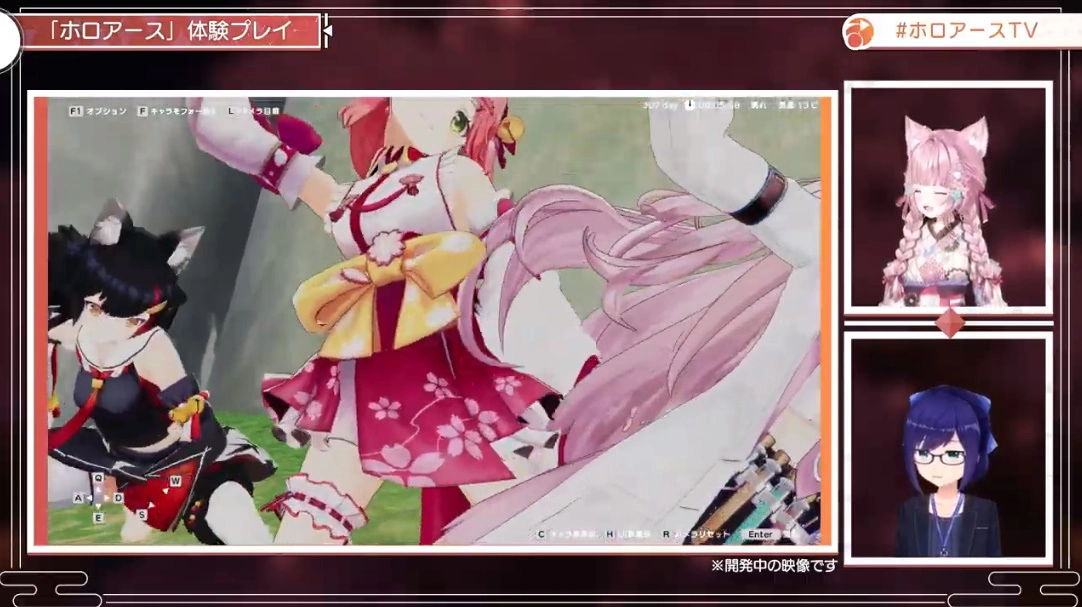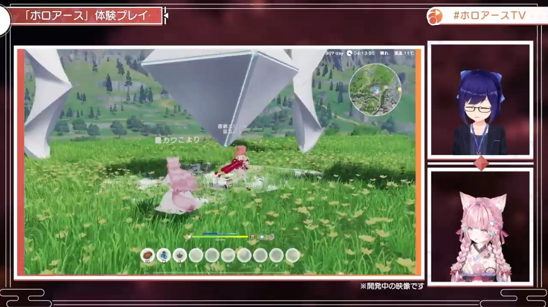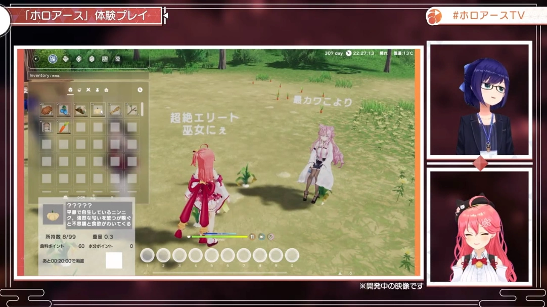 宣传部分结束后接着就是《Holoearth》沙盒游戏部分的实机演示,可以看到樱巫女等人在游戏中操作着自己的形象四处走动,能摆出不同姿势来拍照,在河里游泳也不成问题;而在据点附近的田地则可以自由种植农作物,四人还特别为游戏内的蔬菜和水果取名字,像是臭到不行的蒜头,或叶子宛如兔耳朵的红萝蔔等等,未来上线时会有更多符合 hololive 设定的物品出现。