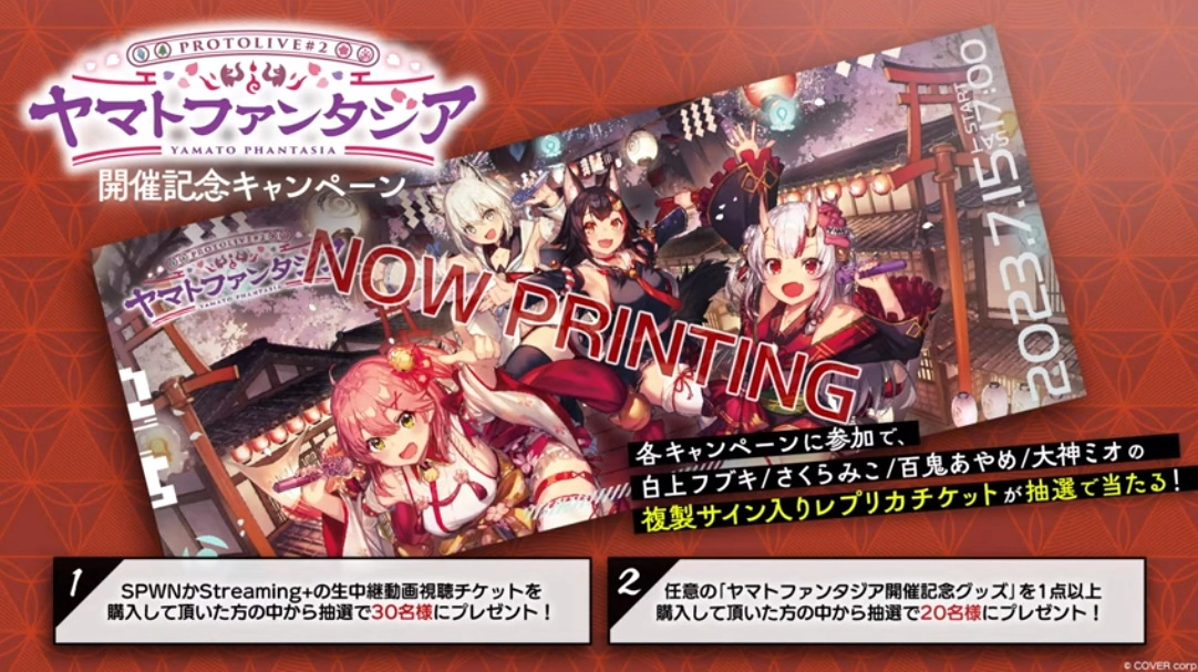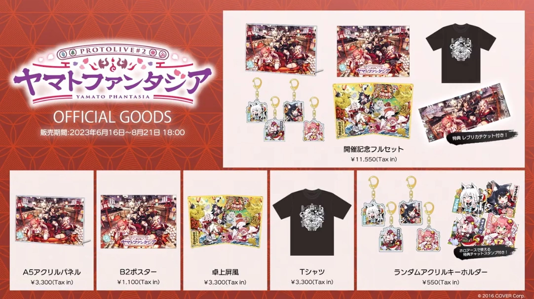 最后也介绍了「Protolive#2 ~Yamato Phantasia~」的原创周边商品,包括 A5 压克力画板、B2 海报、桌上型屏风、T-Shirt 与压克力钥匙圈,若购买纪念套组可获得特典「複製门票」,还会举办有白上吹雪/百鬼绫目/大神澪/樱巫女複製签名门票的抽奖活动,对相关内容感兴趣的话可以到《Holoearth》官网或官方推特确认。