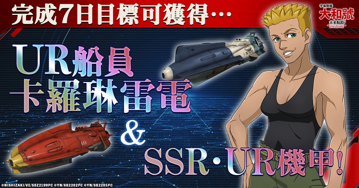 游戏开始后限时7天开放的活动可获得UR船员「卡罗琳雷电」以及SSR・UR机甲与其余各式各样的道具。