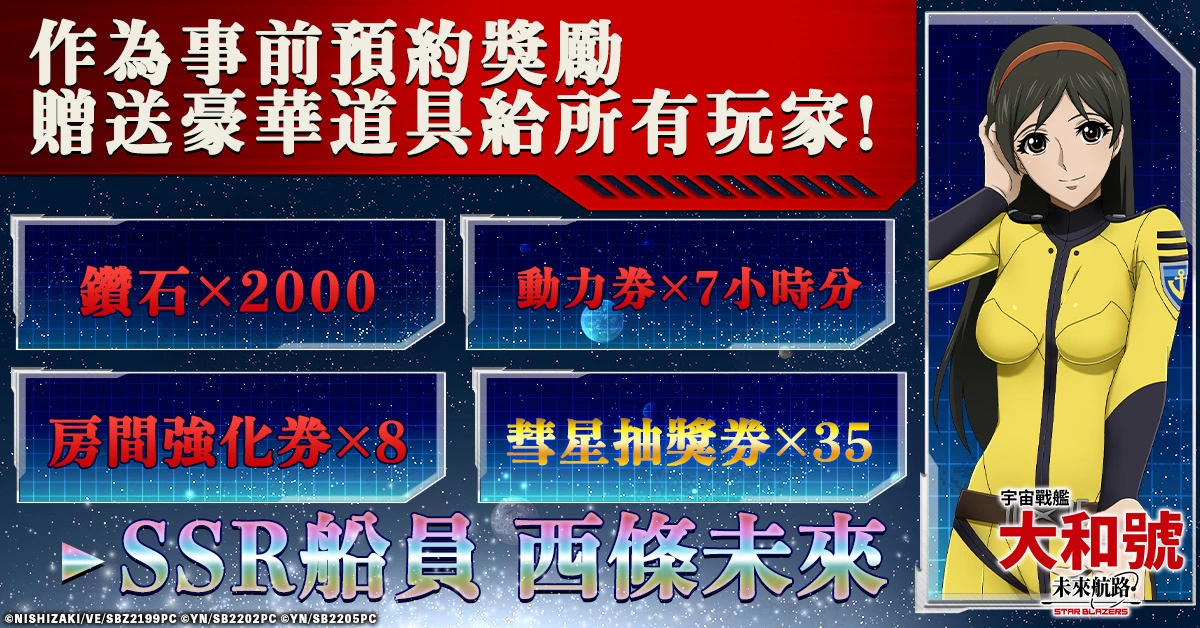 <事前预约达成奖励>钻石×2000、动力券(1分)×120、动力券(1小时)×5、房间强化券 ×8、彗星抽奖券×35、SSR船员「西条未来」。