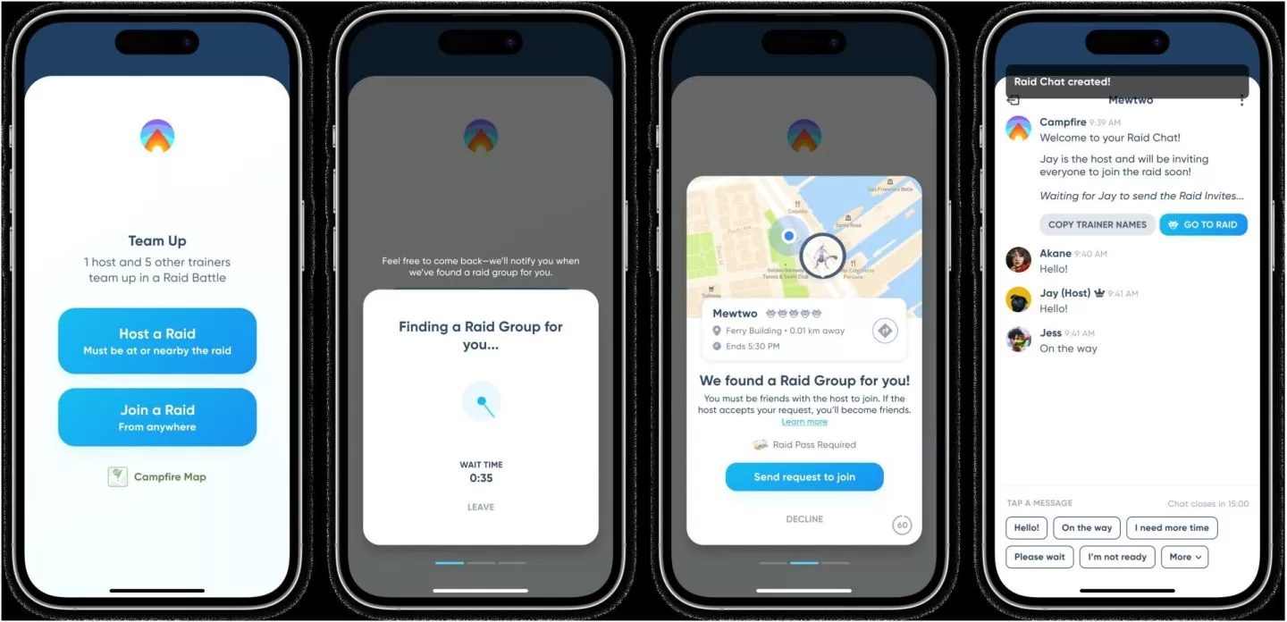 透过这个社群应用程式,可以让训练家和其他训练家互动交流并且找寻最近的团体战,藉此更容易找到当地和远距团体战。只要点击《Pokémon GO》游戏画面中右上角的绿色地图标示,就可以进入「Campfire」并浏览身边的团体战和闪焰活动。