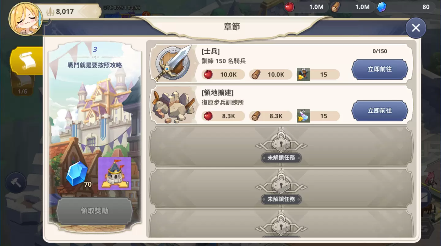 游戏的设计让玩家可以轻鬆理解并学习游戏,因为以网路漫画为基础的故事在教学和章节任务中都有很好地体现。章节任务促使玩家建造建筑物、训练、资源採集与战斗等,进而提升玩家等级。