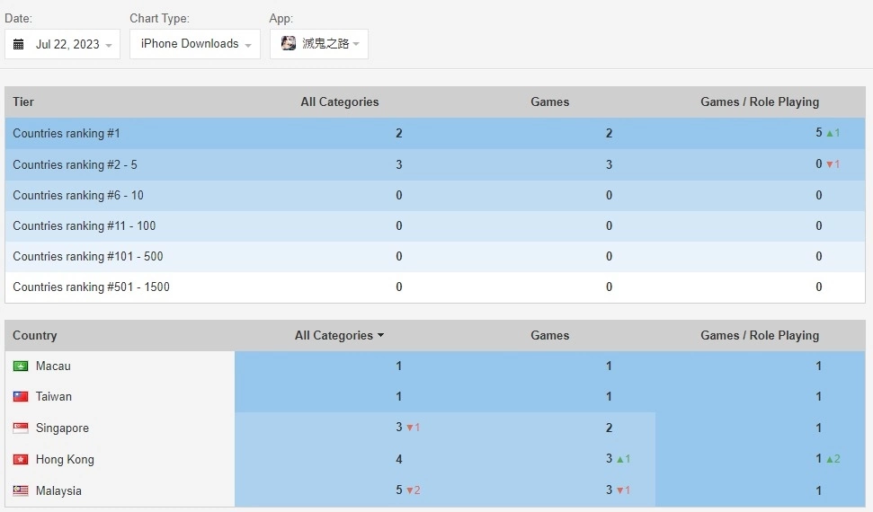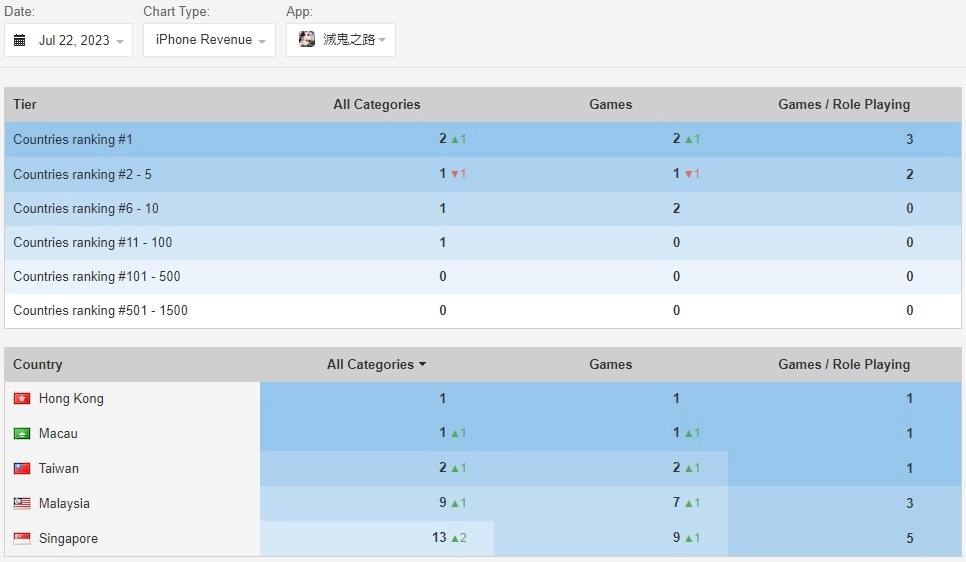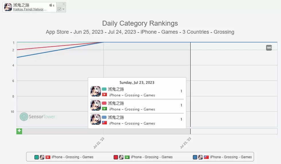 haikou fengli network technology 开发的《鬼灭之刃》手机游戏《灭鬼之路》,自 7 月 21 日起在台港澳 app store 发售以来,短短时间就登上台湾 app store 免费游戏前三名行列。
