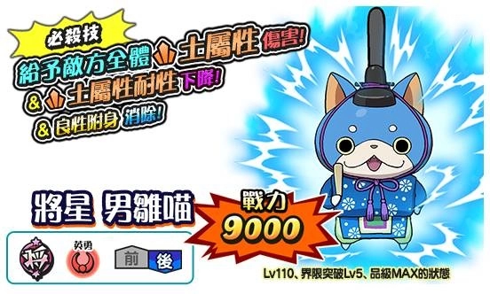 ‧限时妖怪转蛋:虎战士小石狮孙策除了必定给予敌方全体火属性伤害外,低必杀技量与必中攻击等等效果,让小石狮孙策在妨害敌人与攻击都是很有利的武将!
