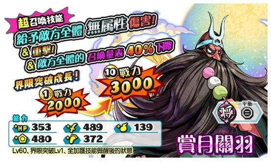 ‧军魔神祭典转蛋-赏月编:赏月关羽拥有的召唤/超召唤技能可以使敌方的召唤量表减少,并且施展速度最快只需要三秒!