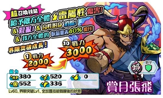‧军魔神祭典转蛋-赏月编:赏月张飞可增加蛇形族、不可思议族30%力量提升与最高70%爆击率加成!另外,赏月张飞还可以和拥有超爆击的前卫怪物合作,提高战斗火力!