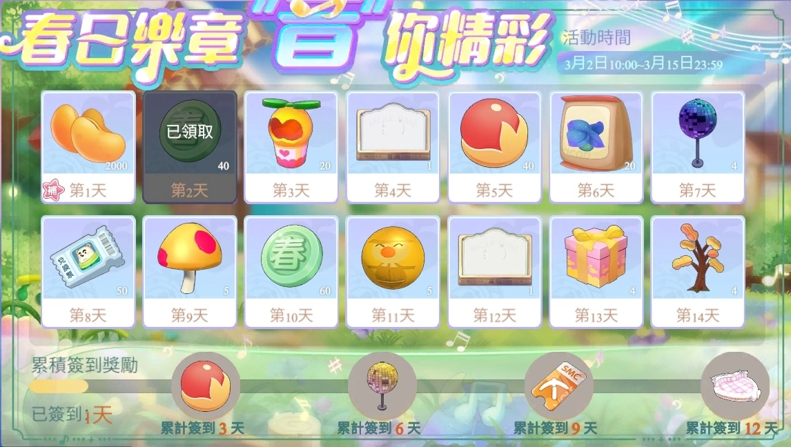 春日乐章,音你精彩!活动期间内每日登入游戏签到即可领取音符能量种子、白色音符纸、金豆、钢琴音色种子、闪亮灯球、大力花生树等精美礼品。累计签到还有金豆*60,乐动闪亮灯球、夹心棉花糖蹦床等额外礼品奖励。