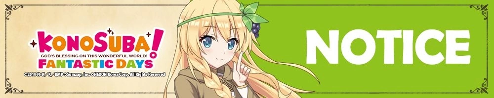 国际版动画手机游戏《为美好的世界献上祝福!Fantastic Days》经营权即将于 6/1 转移,玩家资料也会一併转移到新营运商底下。玩家仅需确保自己的转移用 ID,待转移完成后于新的应用程式中重新登录,即可继续用同样帐号游玩。