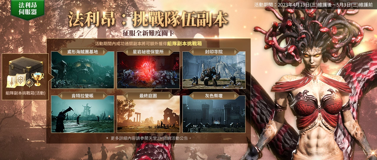 【法利昂:挑战队伍副本】:4/19 维护后~5/3 维护前,活动期间内,通关简单与普通难度的组队副本时,可以额外获得「组队副本挑战箱(活动)」。
