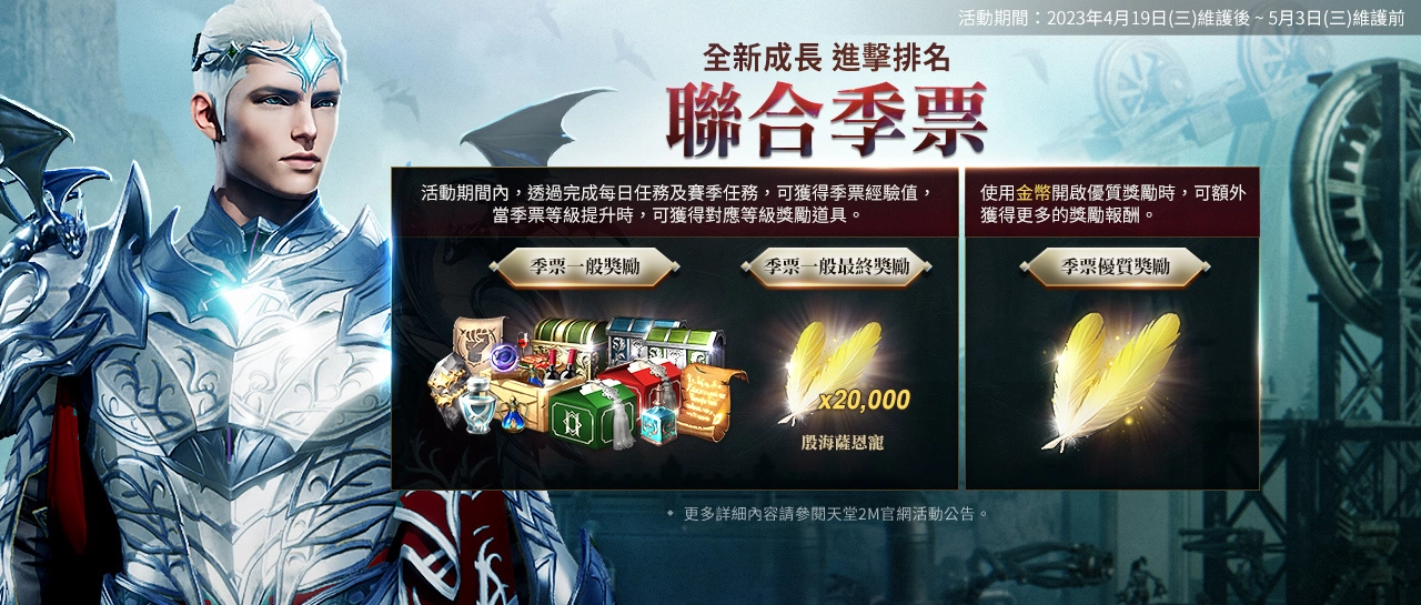 【联合季票】:4/19 维护后~5/3 维护前,活动期间内,透过完成每日任务和赛季任务,可获得季票经验值,当季票等级提升时,可获得对应等级的奖励道具。使用金币开启优质奖励时,可额外获得更多的奖励报酬。