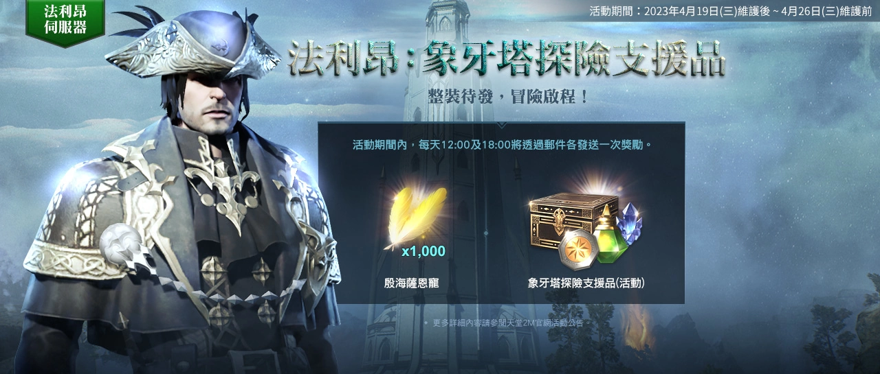 【法利昂:象牙塔探险支援品】:4/19维护后~4/26维护前,活动期间内,每日12:00及18:00将透过邮件各发送一次奖励,可获得「殷海萨恩宠*1,000」与「象牙塔探险支援品(活动)」。