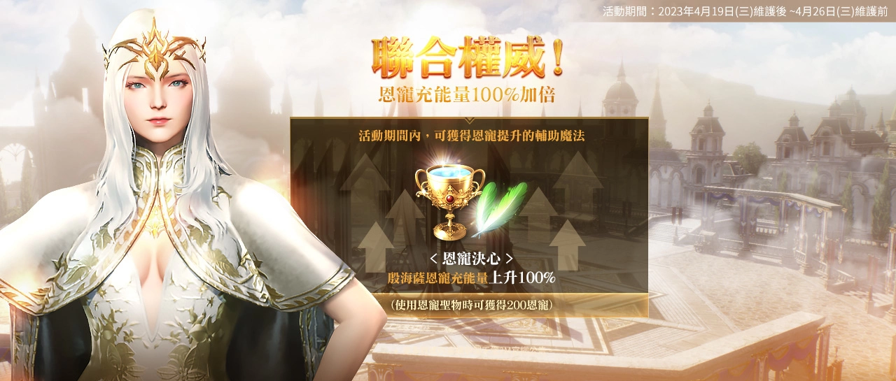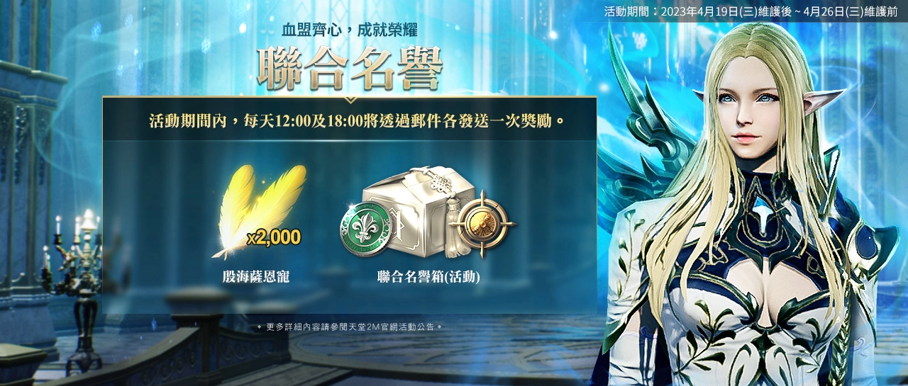 【联合名誉】:4/19 维护后~4/26 维护前,活动期间内,每天 12:00 及 18:00 将透过邮件各发送一次奖励,可获得包含「殷海萨恩宠*2,000」以及「联合名誉箱(活动)」。