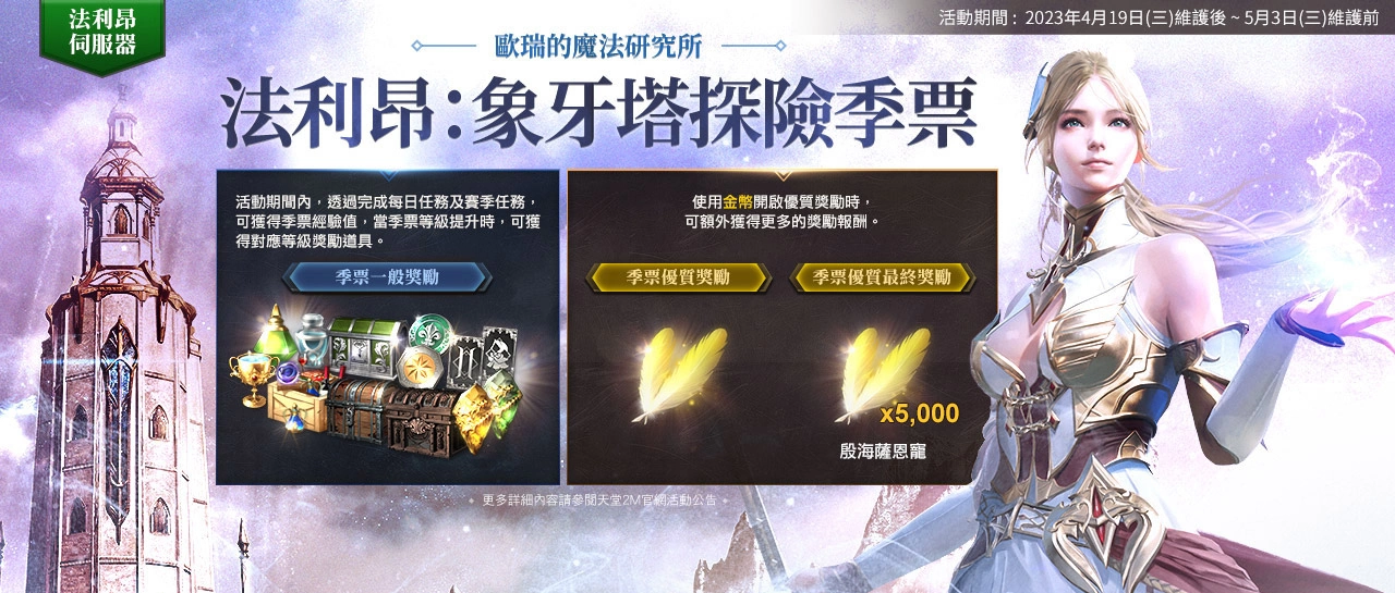 【法利昂:象牙塔探险季票】:4/19维护后~5/3维护前,活动期间内,透过完成每日任务和赛季任务,可获得季票经验值,当季票等级提升时,可获得对应等级的奖励道具。使用金币开启优质奖励时,可额外获得更多的奖励报酬。