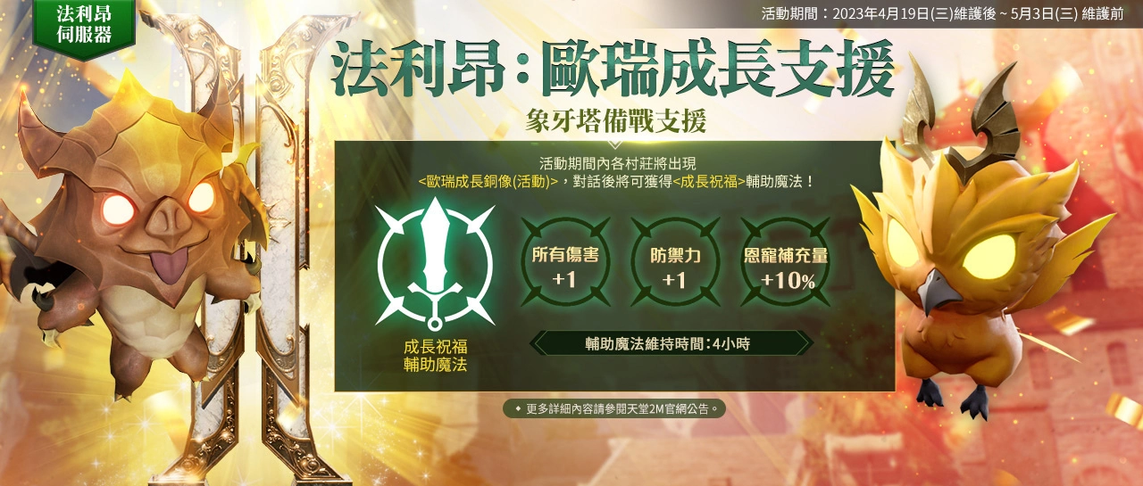 【法利昂:欧瑞成长支援】:4/19 维护后~5/3 维护前,活动期间内,各村庄将出现 NPC「象牙塔探险支援欧瑞成长铜像(活动)」,对话后将可获得「成长祝福」辅助魔法。